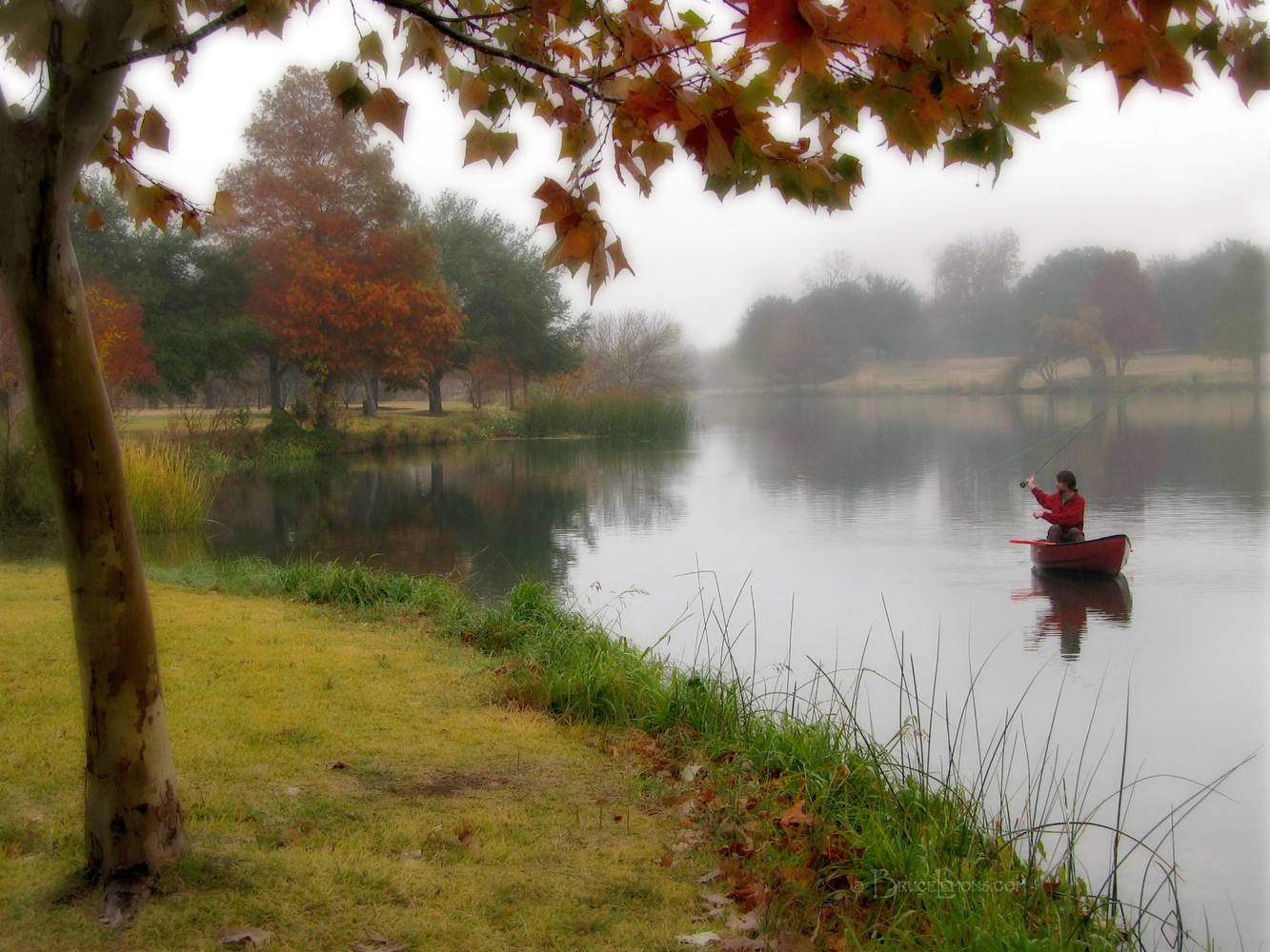 Fly Fisherman on Lady Bird Lake in the Fall at Festival Beach - Austin - Texas
