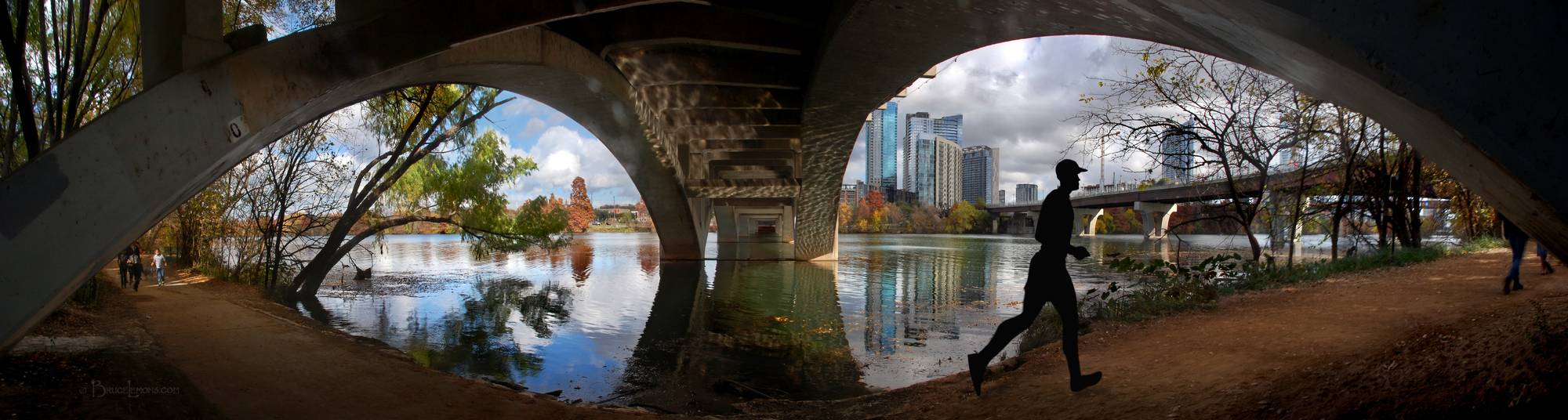 Runner on the Trail Under Lamar Bridge on Lady Bird Lake - Austin - Texas Runner on the Butler hike and bike running trail under Lamar Bridge on Lady Bird Lake with downtown reflected in the background. Lamar Bridge, Lady Bird Lake, Austin, Texas.
