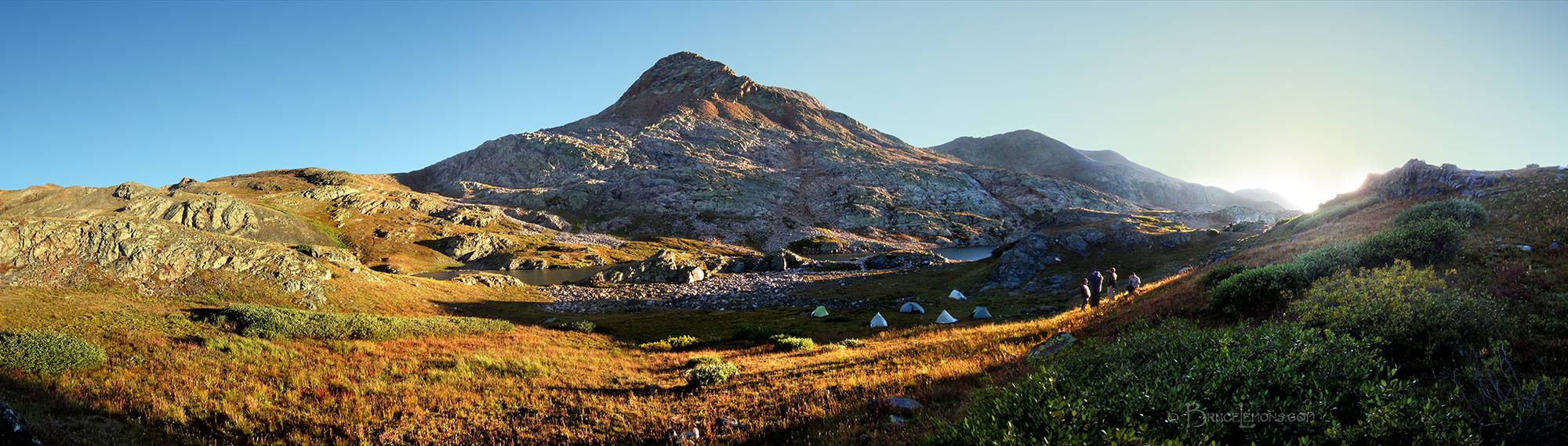Sunset at Eldorado Lake - Weminuche Wilderness - Colorado A golden sunset panorama at Eldorado Lake with hikers at camp in the foreground and White Dome in the background. Colorado, San Juan National Forest, Weminuche Wilderness, Eldorado Lake.