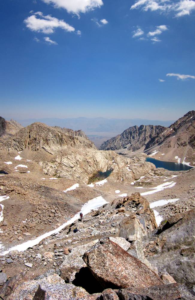 Midway down the 96 switchbacks looking E towards Whitney Portal, (out of sight way down the valley). Trailcamp is right of the center lake below, Consultation lake to the right. California, Sierra Nevada Mountains, Sequoia National Park, Mt Whitney Trail. John Muir Trail Mile 213.