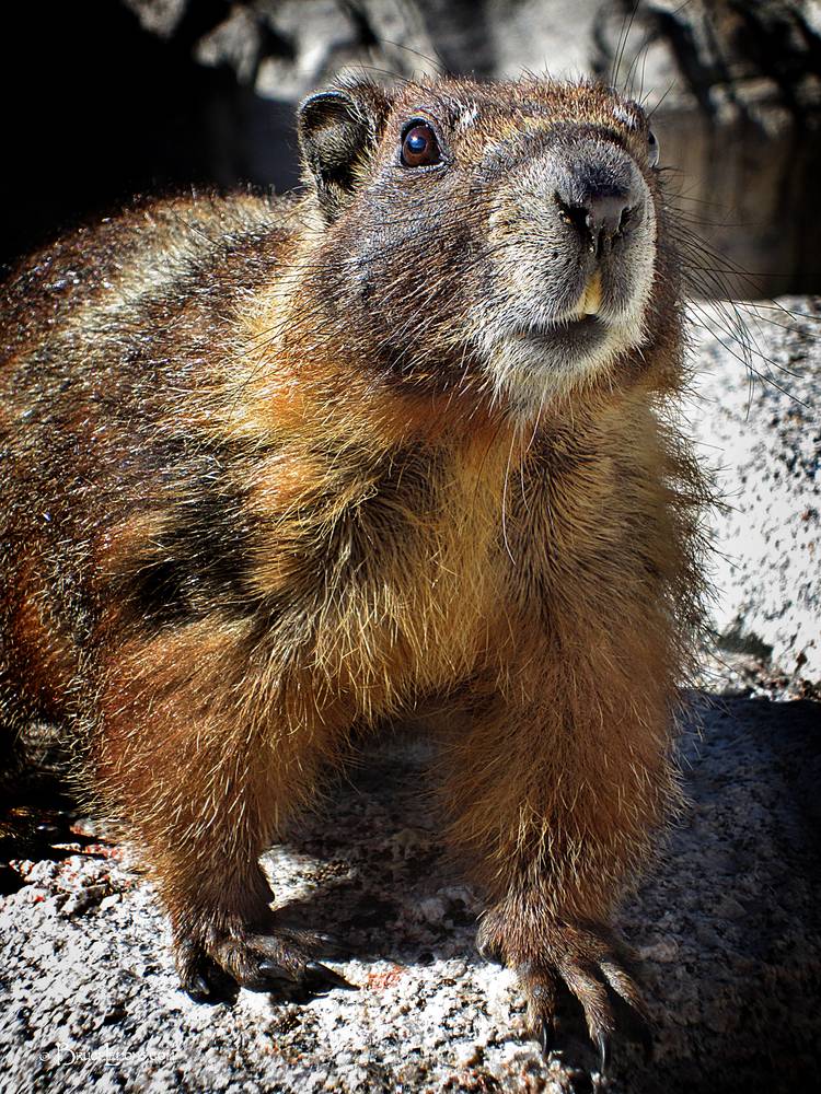 Yellow Bellied Marmot - John Muir Trail Yellow Bellied Marmot. California, Sierra Nevada Mountains, John Muir Wilderness, Mt Whitney Trail, Trail Camp. John Muir Trail Mile 214.