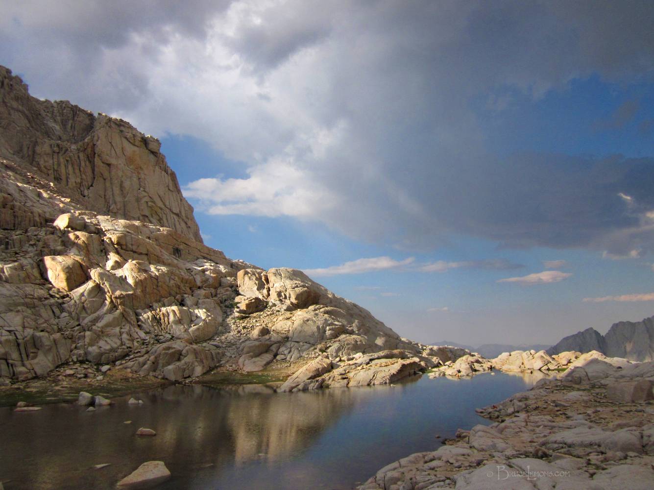 Looking ENE across Trail Camp Lake to Wotans Throne on the left. California, Sierra Nevada Mountains, John Muir Wilderness, Mt Whitney Trail, Trailcamp. John Muir Trail Mile 214.