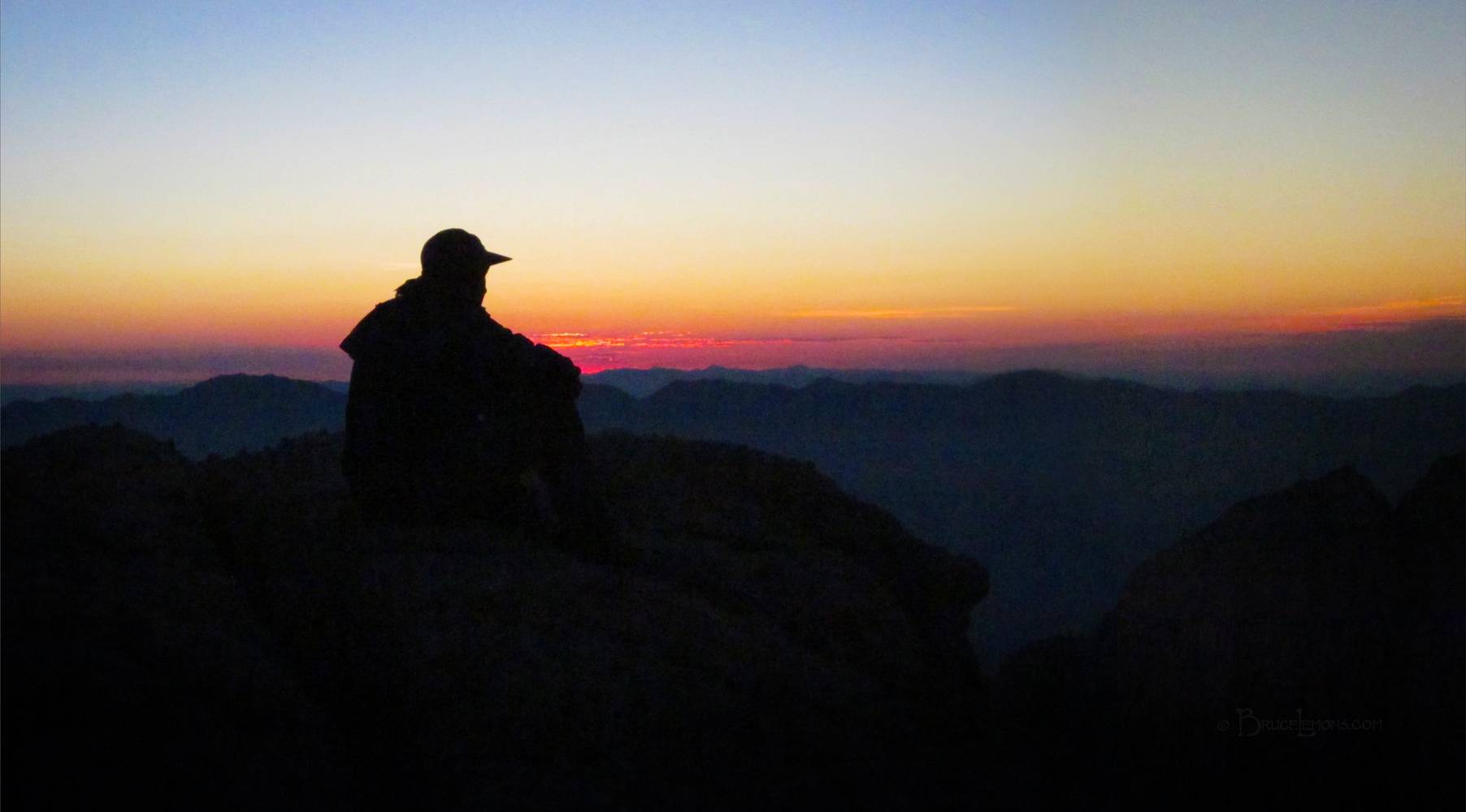 Wotans Throne Sunrise Silhouette - Sierra Hiker on Wotans Throne looking E over Owens Valley at sunrise. California, Sierra Nevada Mountains, John Muir Wilderness, Mt Whitney Trail, Wotans Throne. Off the John Muir Trail near Mile 214.