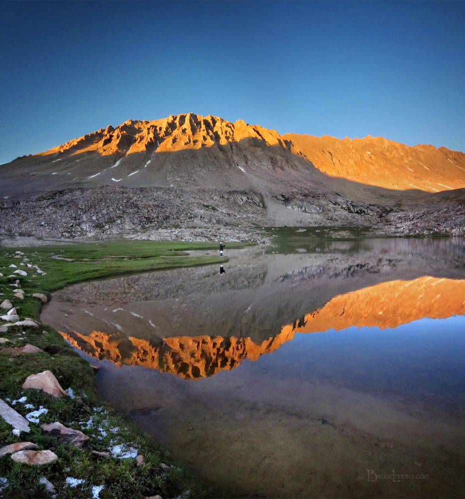 Looking E across the Guitar Lake shoreline and a fly fisherman to Mt Whitney catching the sunset alpenglow. California, Sierra Nevada Mountains, Sequoia National Park, Guitar Lake. John Muir Trail Mile 206.