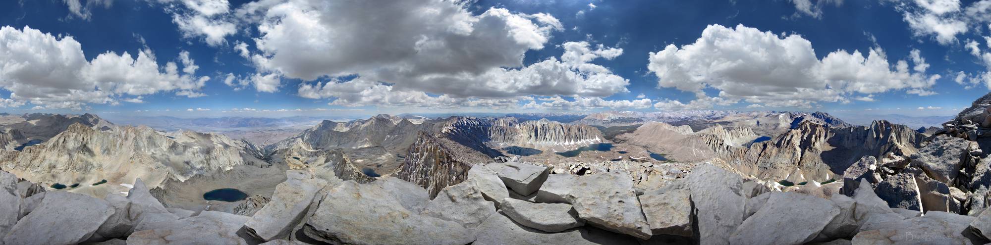 360 degree panorama from atop Mt Whitney with left to right Wales Lake,Mt Russell,Iceberg Lake, North fork Lone Pine Creek, Whitney Portal, Owens Valley, Alabama Hills, Lone Pine, Lone Pine Peak, Pinnacle Ridge, Wotans Throne, Mt McAdie, Keler Needle, Mt Muir, Hitchcock Lakes, Mt Hitchcock, Crabtree Meadows, Guitar Lake, Mt Young, Bighorn plateau, Mt Hale, Wales Lake, Mt Russell. California, Sierra Nevada mountains, Sequoia National Park. John Muir Trail Mile 210.