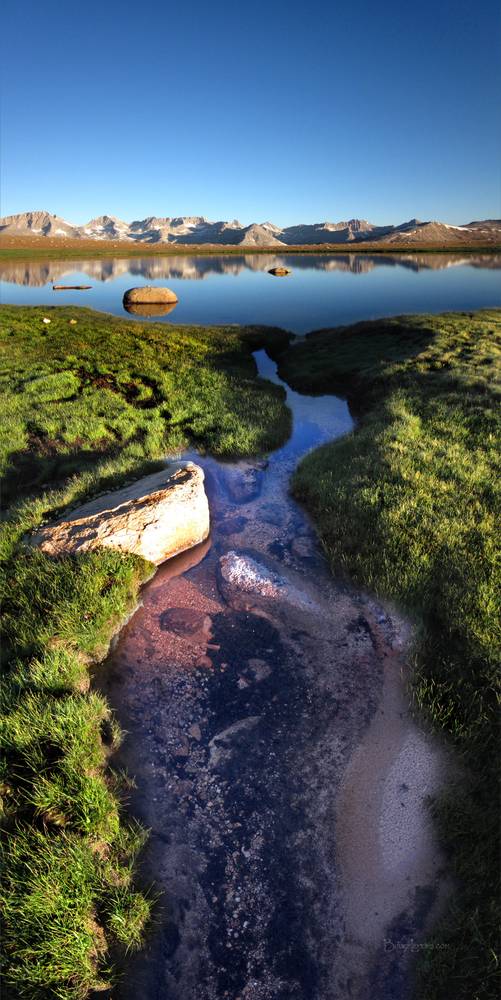 Bighorn Plateau Creek and Lake - John Muir Trail Looking SW over Bighorn Plateau Lake and creek outlet. California, Sierra Nevada Mountains, Sequoia National Park, Bighorn Plateau. John Muir Trail Mile 196.