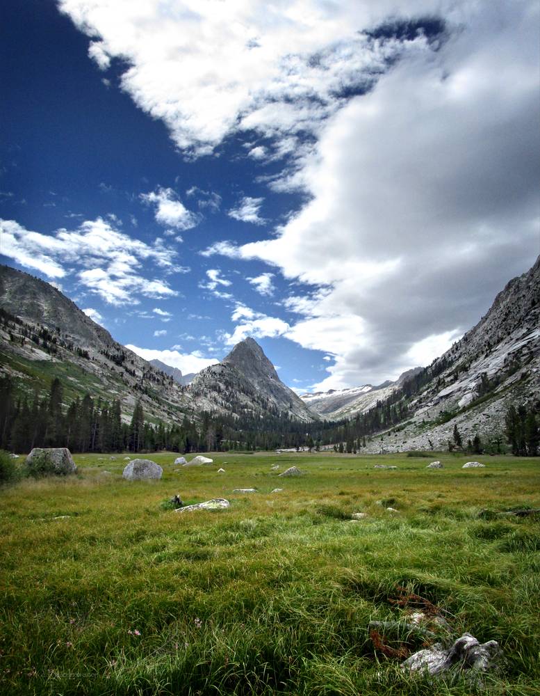 Whaleback in Cloud Canyon - Sierra Looking S in Cloud Canyon across Big Wet Meadow to Whaleback. California, Sierra Nevada Mountains, Sequoia National Park. Off the John Muir Trail near Mile 199.