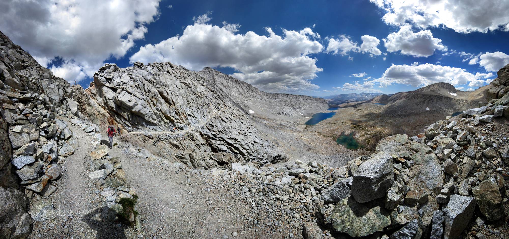 Panorama of hikers on the the S side cliff face catwalk trail coming down from Forester Pass. Looking E from the switchbacks as they begin winding down left of frame from the notch of the pass upper left, and cross the chute directly below the notch, (requiring a snow traverse most early seasons), to traverse the sheer cliff at center, before switchbacking down to the unamed lakes below. This section demonstrates some of the most amazing trail construction on the trail, with 10-15 foot dry stacked stone walls supporting the trail carved into almost vertical cliff. Rounded Caltech Peak at right, pointy Junction Peak at center, the wall of Diamond Mesa running right from it across center, with Tawny Point and Bighorn Plateau peeking from it's right end, and Tyndall Creek in front below draining to the Kern Canyon just n front of the Kern and Kaweah ranges on the horizon. California, Sierra Nevada Mountains, Sequoia National Park, Forester Pass. John Muir Trail Mile 190.