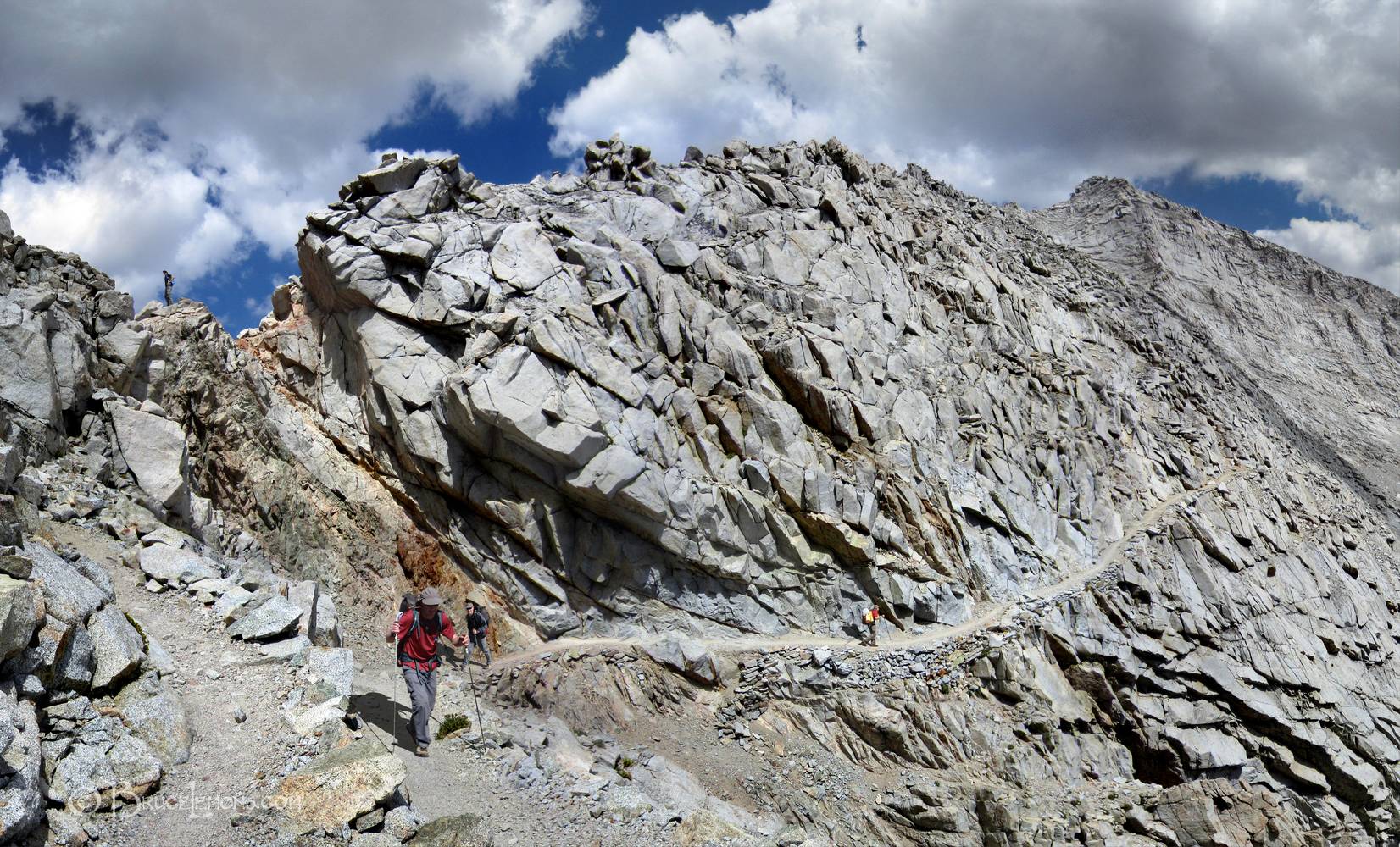 Panorama of hikers on the the S side cliff face catwalk trail coming down from Forester Pass. Looking E from the switchbacks as they begin winding down left of frame from the notch of the pass upper left, and cross the chute directly below the notch, (requiring a snow traverse most early seasons), to traverse the sheer cliff at center, before switchbacking down to the unamed lakes below. This section demonstrates some of the most amazing trail construction on the trail, with 10-15 foot dry stacked stone walls supporting the trail carved into almost vertical cliff. Rounded Caltech Peak at right, pointy Junction Peak at center, the wall of Diamond Mesa running right from it across center, with Tawny Point and Bighorn Plateau peeking from it's right end, and Tyndall Creek in front below draining to the Kern Canyon just n front of the Kern and Kaweah ranges on the horizon. California, Sierra Nevada Mountains, Sequoia National Park, Forester Pass. John Muir Trail Mile 190.