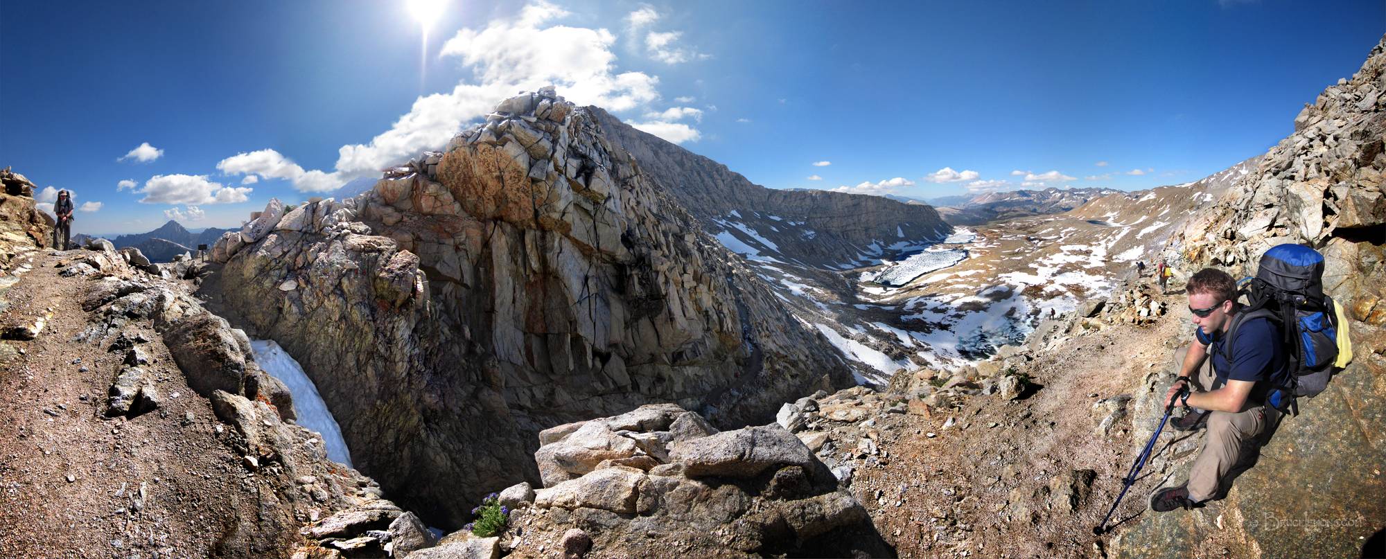 Looking N out above Bubbs Creek Valley to University Peak at left, and looking S along the ridge that ends in Diamond Mesa at right. The trail rises up from the N behind the hiker at left, crosses where the photographer is standing beside a steep chute at center, wraps around to S side of pass by the hiker to right, then switchbacks down to cross the chute below where the next few turns of continuing switchbacks can be seen in shadow down at center right. Tawny Point, where the trail leads, peaks from behind Diamond Mesa center right. California, Sierra Nevada Mountains, Sequoia National Park, Forester Pass. John Muir Trail Mile 190.