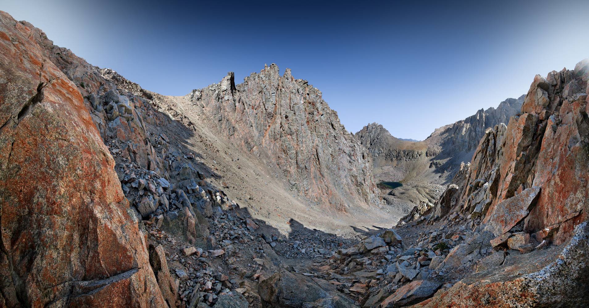 Looking NNW down Harrison Pass. California, Sierra Nevada Mountains, Kings Canyon National Park, Harrison Pass. Off the John Muir Trail near Mile 192.