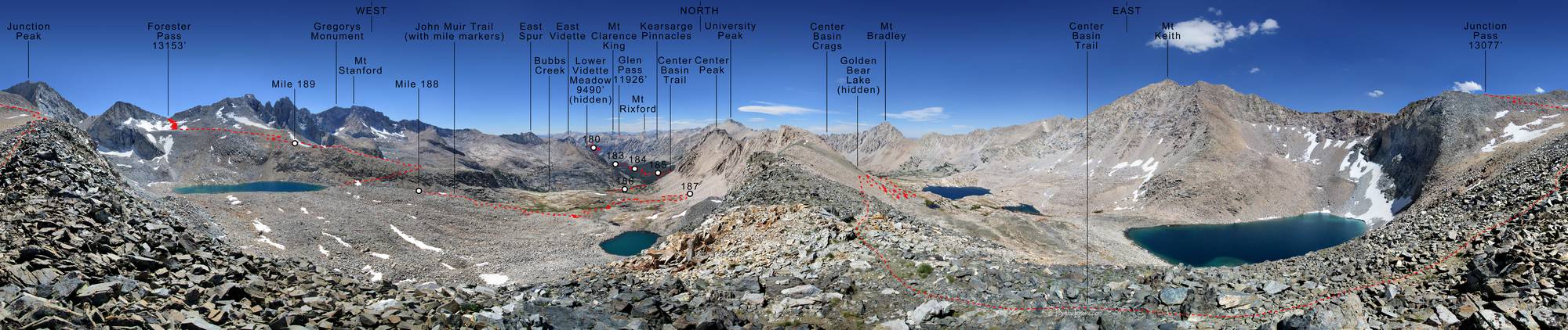 Forester Pass Bubbs Creek and Center Basin from Junction Peak Ridge with Notes - Sierra