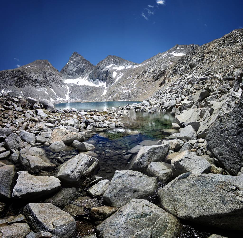Looking SSW up to Junction Peak on the left and Forester Pass on the right from the unamed lake N of the pass. California, Sierra Nevada Mountains, Kings Canyon National Park. John Muir Trail Mile 188.