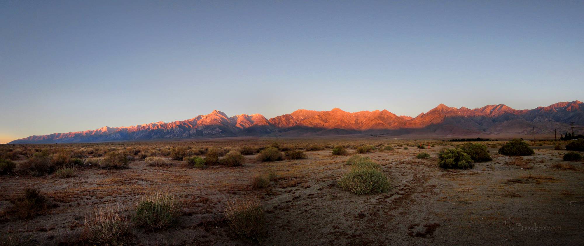 Looking W at sunrise alpenglow on the Eastern Sierra Crest from Independence. Onion Valley is to the right of the high pointy peak just above the orange pylons to far right. Onion Valley Road is just visible winding below and up to the trailhead below Kearsarge Pass. Whitney Portal is to the right of the pointy little white peak to the far left. Due to our low view angle, Mt Whitney, set farther back down the Whitney Portal valley, does not appear the tallest. It might be just barely visible peaking behind. The highest appearing peak from this location, at center, is Mt Williamson. California, Sierra Nevada Mountains, Owens Valley, Independence. Off the John Muir Trail near Mile 220.