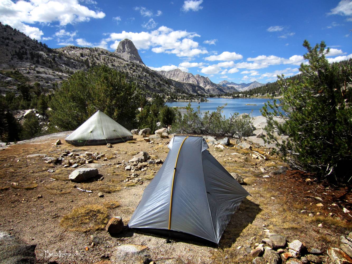 Camp at Middle Rae Lake - John Muir Trail Campsite on the isthmus between Upper and Lower Rae Lakes, looking NNW across Middle Rae Lake to Fin Dome. California, Sierra Nevada Mountains, Kings Canyon National Park. John Muir Trail Mile 176.