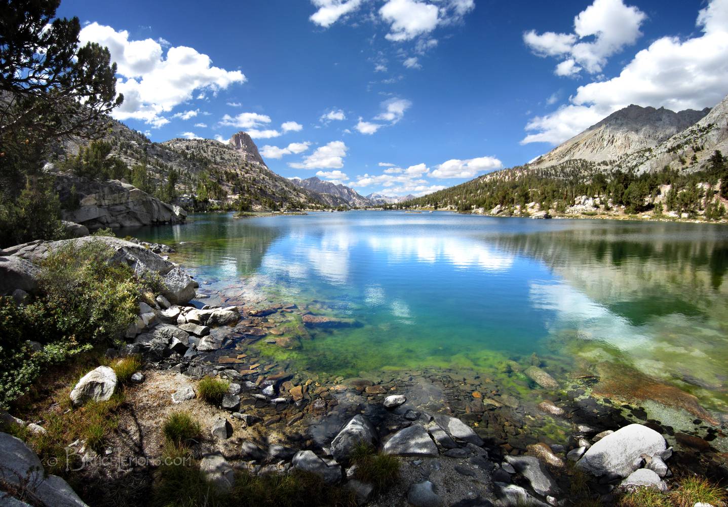 Middle Rae Lake and Fin Dome 2 - John Muir Trail Looking NNW to the thumb like Fin Dome at left, from the S end of Middle Rae Lake. California, Sierra Nevada Mountains, Kings Canyon National Park, Rae Lakes. John Muir Trail Mile 176.