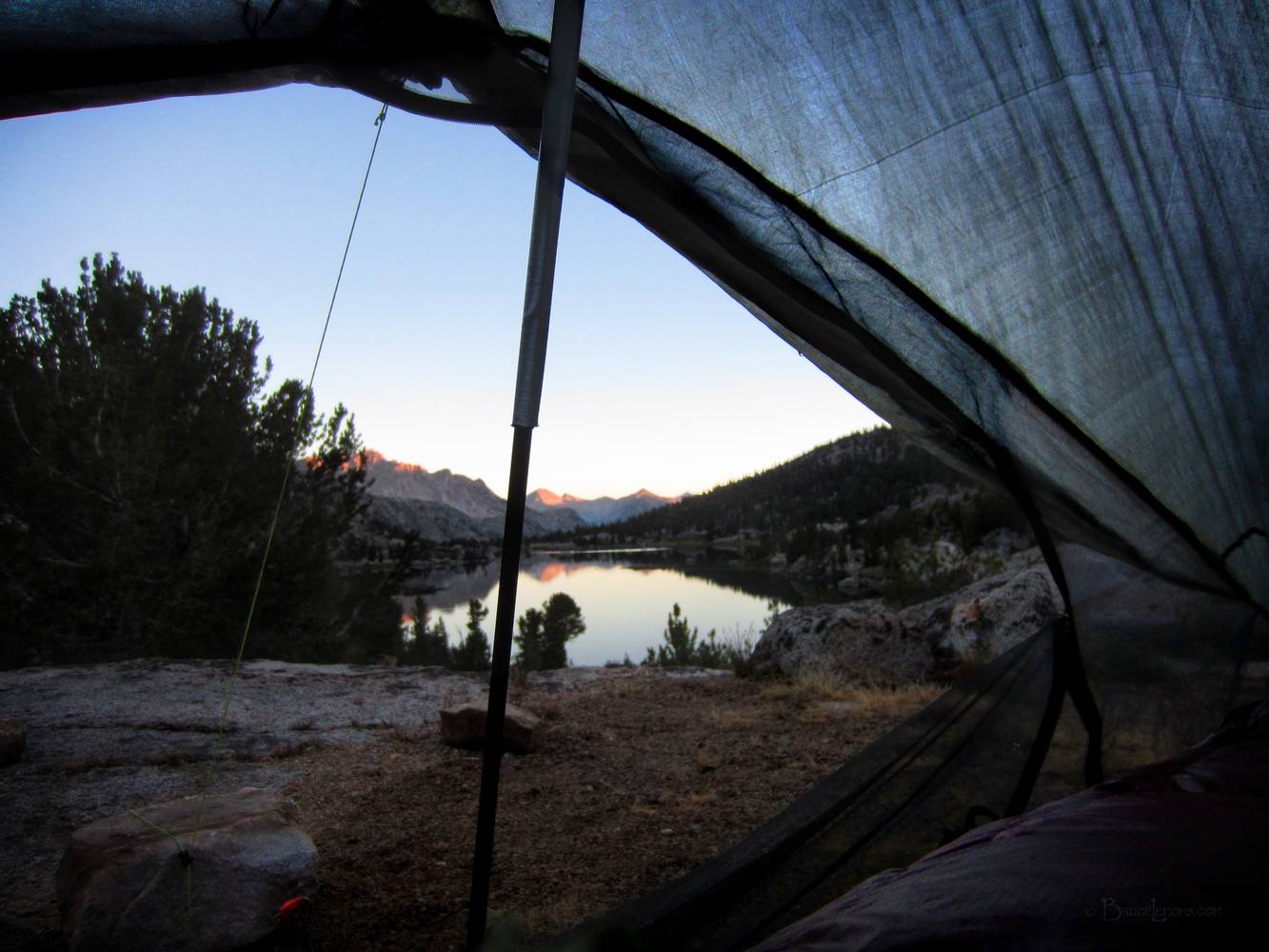 Rae Lakes Sunrise from Tent - John Muir Trail Looking NNW at sunrise across Middle Rae Lake from tent on isthmus between Upper and Middle Rae Lakes. California, Sierra Nevada Mountains, Kings Canyon National Park. John Muir Trail Mile 176.