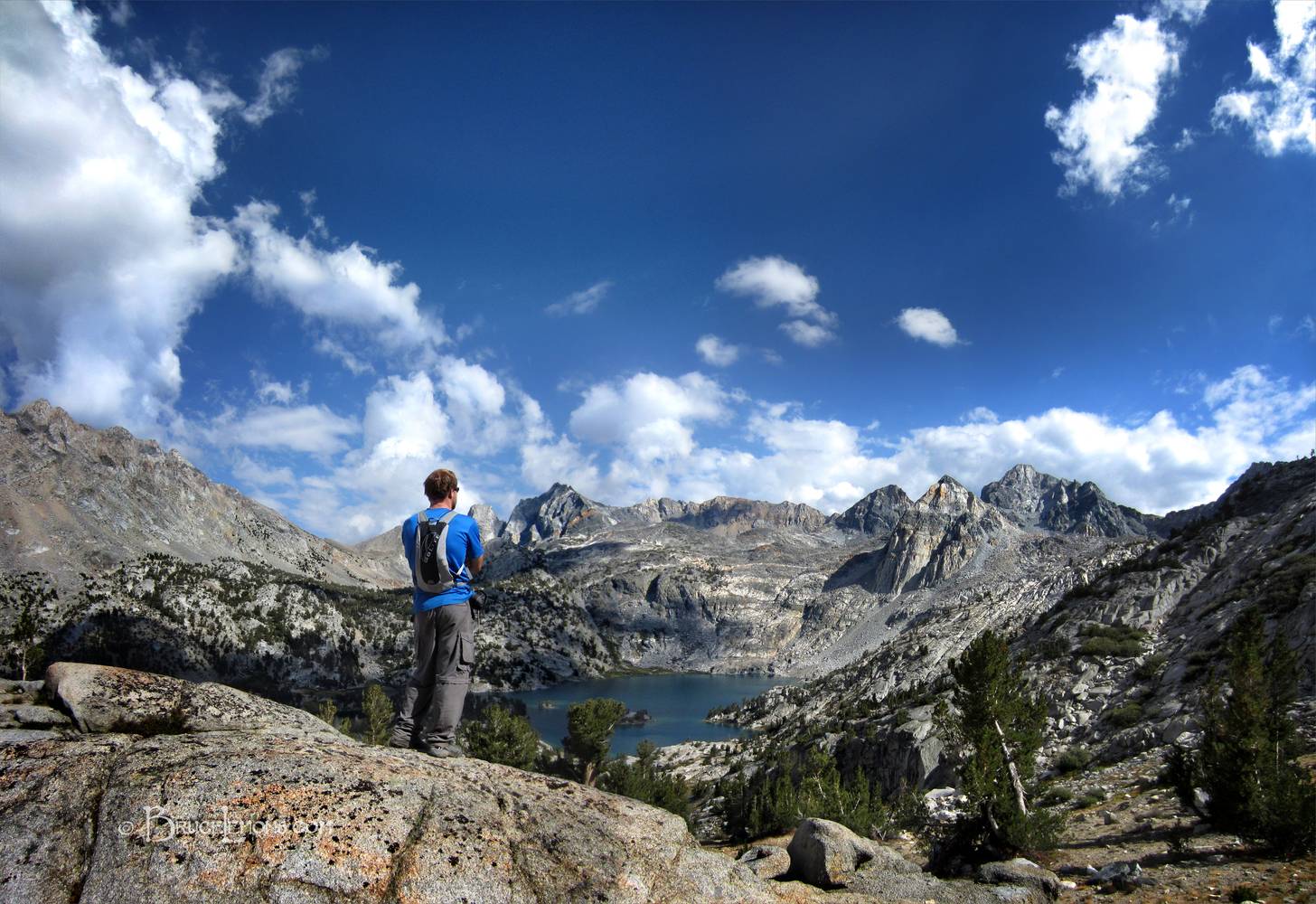 Hiker on the Sixty Lakes Basin Trail looking SE over Upper Rae Lake to Painted Lady at right, and Dragon Peak at center. California, Sierra Nevada Mountains, Kings Canyon National Park. Off the John Muir Trail near Mile 176.