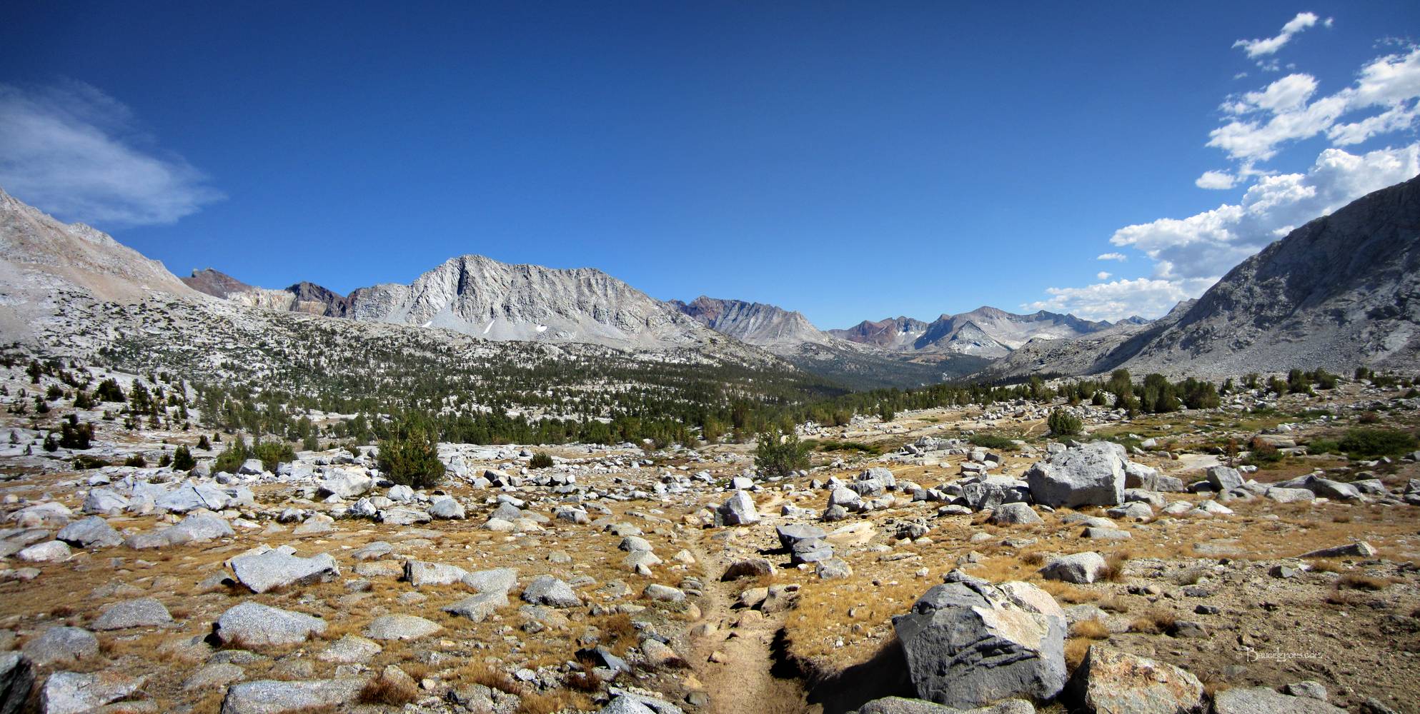 Looking Looking SSE from th lower part of Upper Basin across the South Fork of the Kings River towards Pinchot Pass. Red colored Mt Pinchotleft center far horizon, red colored Crater Mountain to right, ang Mt Ickes farther right. California, Sierra Nevada Mountains, Kings Canyon National Park, Upper Basin. John Muir Trail near Mile 154.