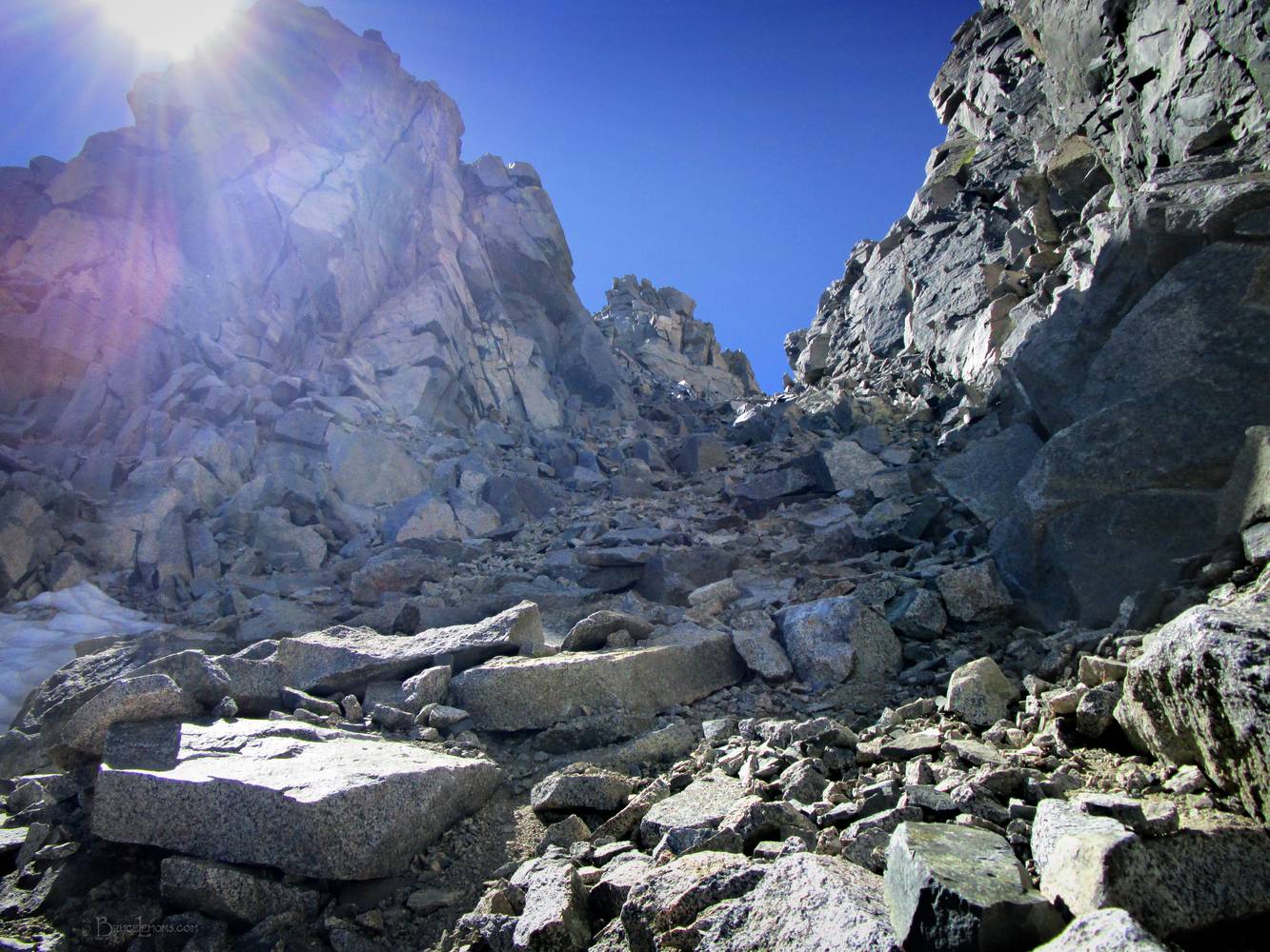 Looking SW up the east side of Lane Pass on the Sierra Crest between Ed Lane Peak and Birch Mtn. Off the John Muir Trail near Mile 153.