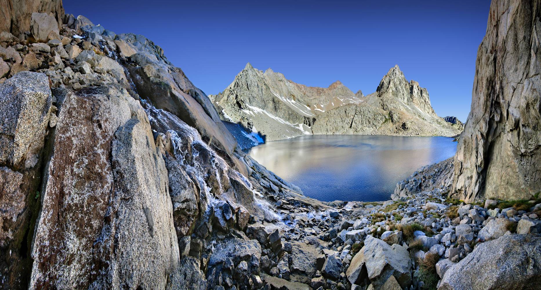 En route to Echo Col, looking W across Echo Lake and an inlet waterfall to Picture Peak at right, the tip of Mt Haeckel center right, red tipped Mt. Wallace at center, and Clyde Spires at left. Off the John Muir Trail near Mile 131.