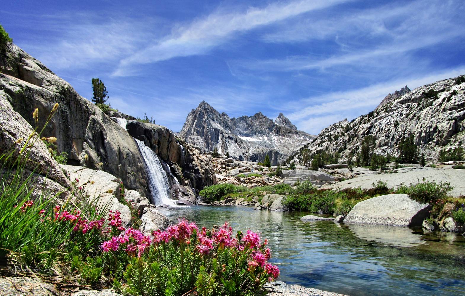 Wildflowers at Moonlight Falls View to Picture Peak Detail - Sierra Looking SW to Picture Peak from Moonlight Falls with Red Mountain Heather wildflowers in the foreground. Off the John Muir Trail near Mile 131.
