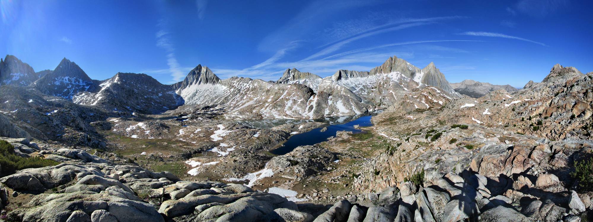 Vee Lake from High Above - Sierra Looking South West down at Vee Lake from above, with Seven gables to the right. California, Sierra Nevada mountains, John Muir Wilderness. Off the John Muir Trail near Mile 097.