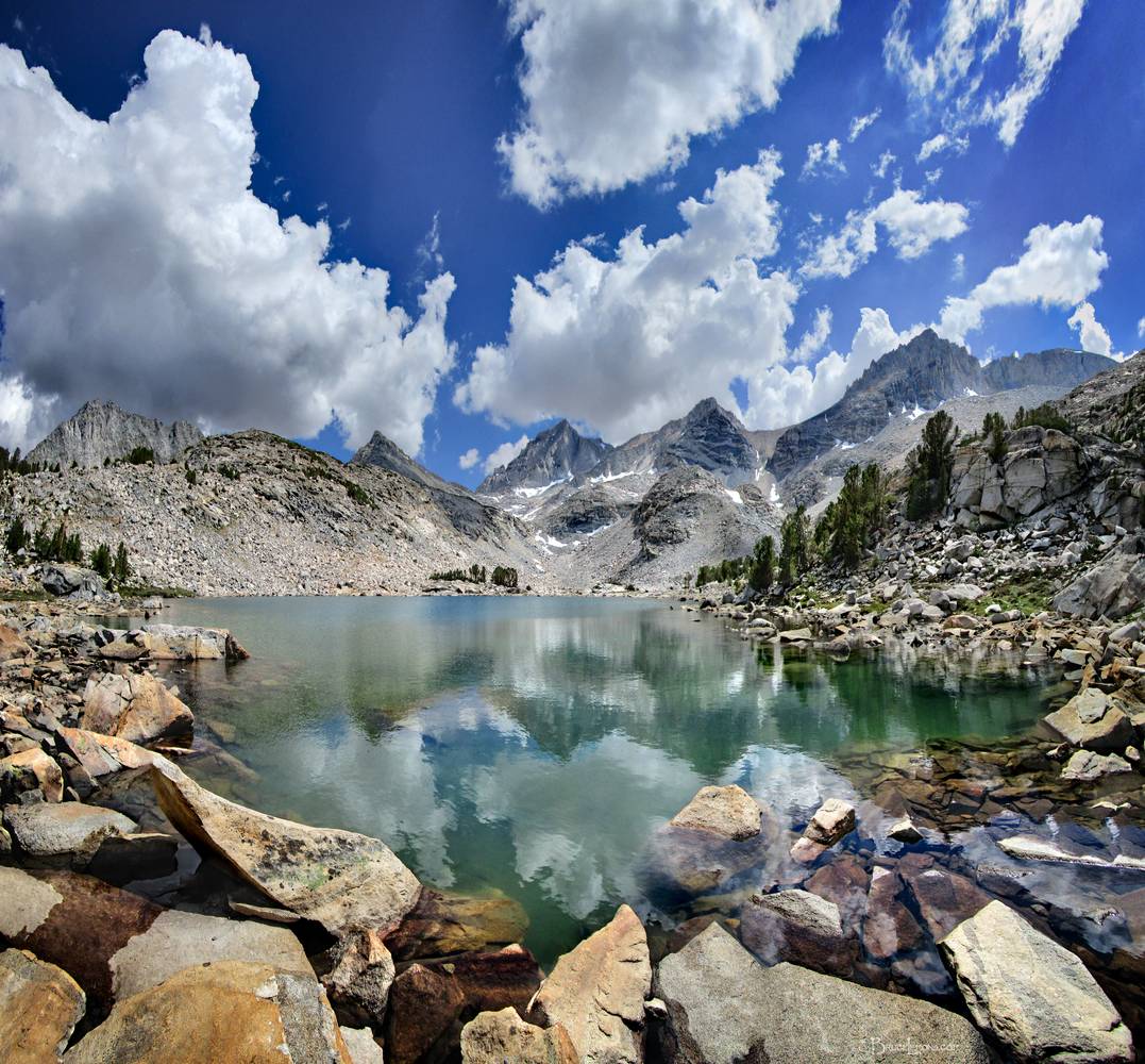 Bear Creek Spire from Treasure Lakes - Sierra Looking S across Treasure Lakes to Pyramid Peak, Bear Creek Spire, and Dade Peak left to right. Off the John Muir Trail near Mile 087.