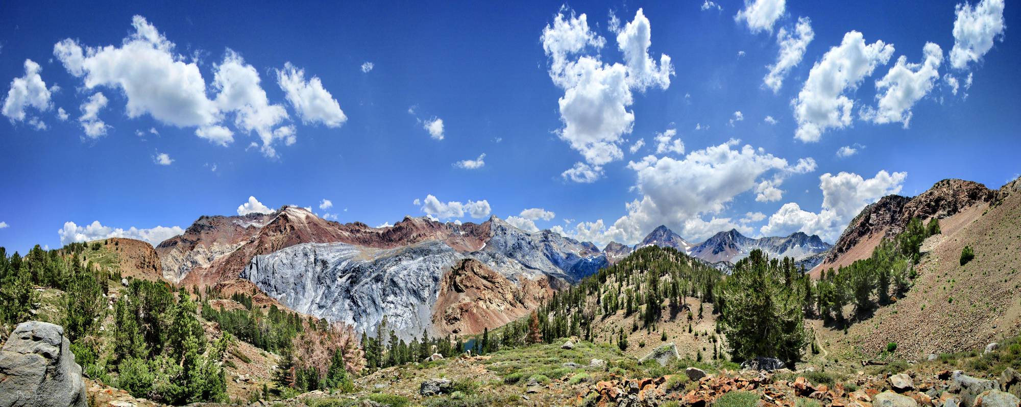 Looking E across Mildred lake to Mt Morrison and Mt Baldwin from the outlet of Dorothy Lake. Off the John Muir Trail near Mile 077.