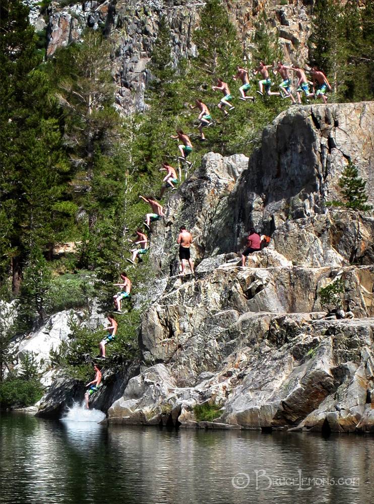 Freeze frame motion capture of cliff jumper at Arrowhead Lake. California, Sierra Nevada Mountains, Mammoth Lakes, Arrowhead Lake. Off the John Muir Trail near Mile 060.