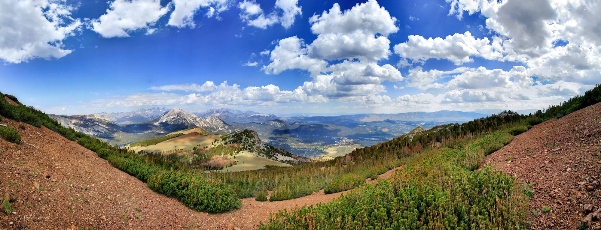 Looking NW from Red Peak to Mammoth Mtn across the Mammoth Lakes Basin, with the Mammoth Crest at left, the Minarets behind Mammoth Mtn left on the far horizon, and the town of Mammoth Lakes at center right. Off the John Muir Trail near Mile 063.