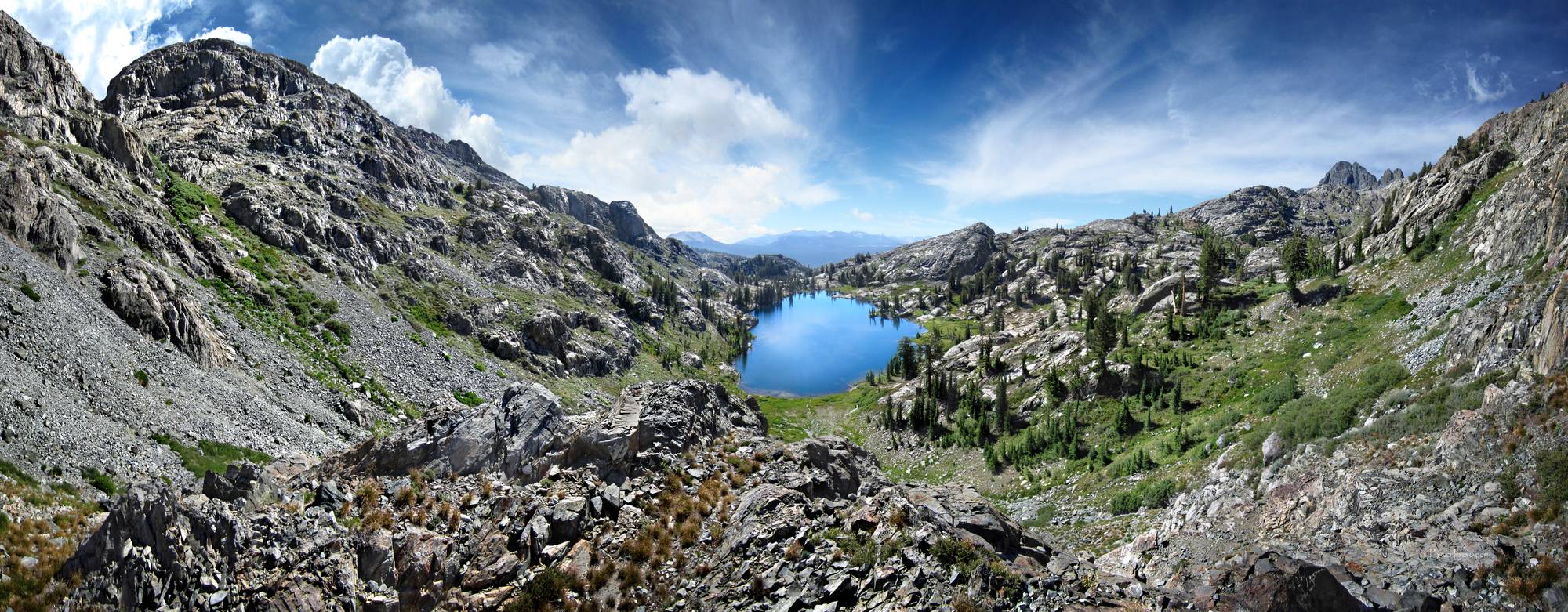 Holcomb Lake Overlook - Sierra Looking E over and across Holcomb Lake. California, Sierra Nevada mountains, Ansel Adams Wilderness. Off the John Muir Trail near Mile 057.