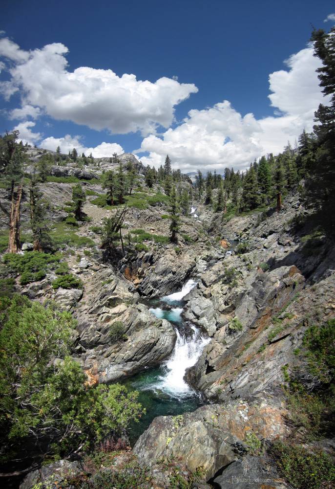 Waterfalls below Hemlock Crossing on the North Fork of the San Joaquin River. California, Sierra Nevada Mountains, Ansel Adams Wilderness, Hemlock Crossing. Off the John Muir Trail near Mile 000.