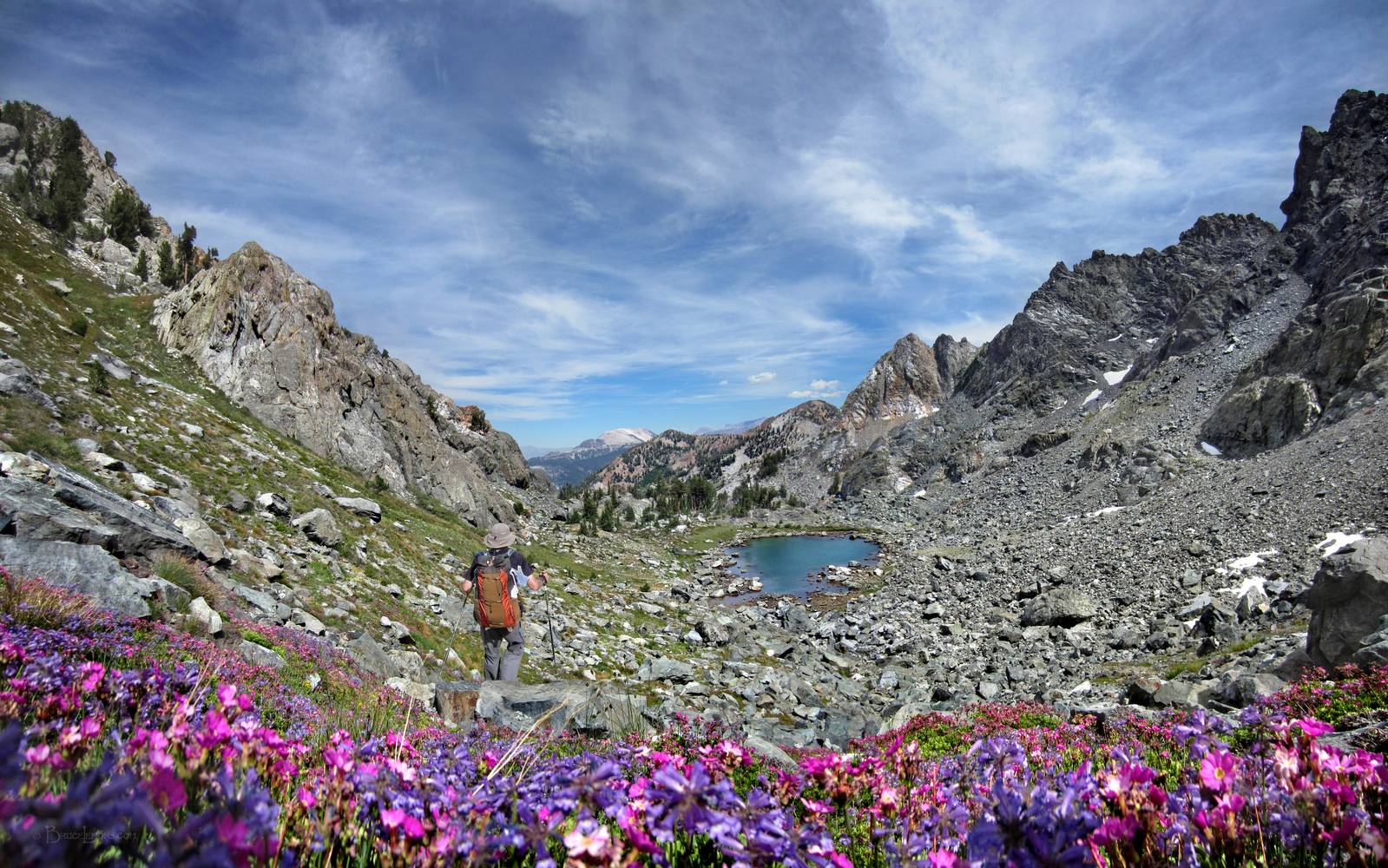 Looking E from below Minarets across hiker in wildflowers at tarn in basin between Deadhorse and Beck Lakes basins. California, Sierra Nevada mountains, Ansel Adams Wilderness. Off the John Muir Trail near Mile 057.