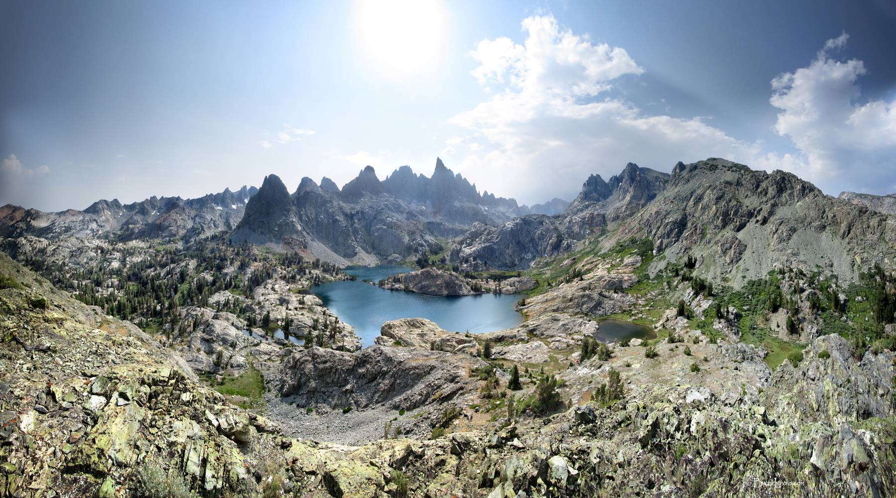 Minaret Lake from Peak 10213 - Sierra Looking W from Peak 10213 across Minaret Lake to the Minarets, with Pridham Minaret closest at center left and Clyde Minaret most pointy at center. Off the John Muir Trail near Mile 056.