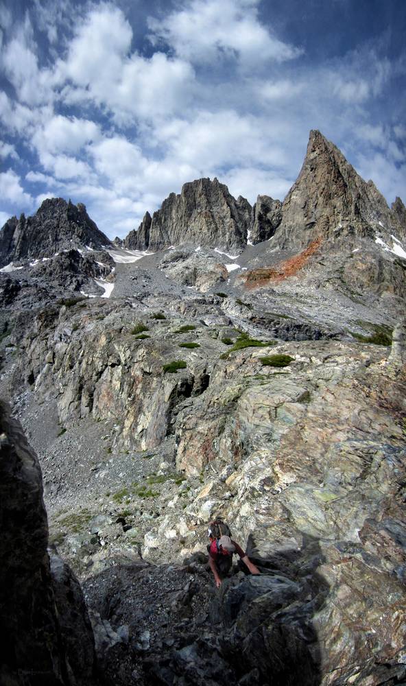 Hiker Climbing Notch Between Minaret and Cecile Lakes - Sierra
