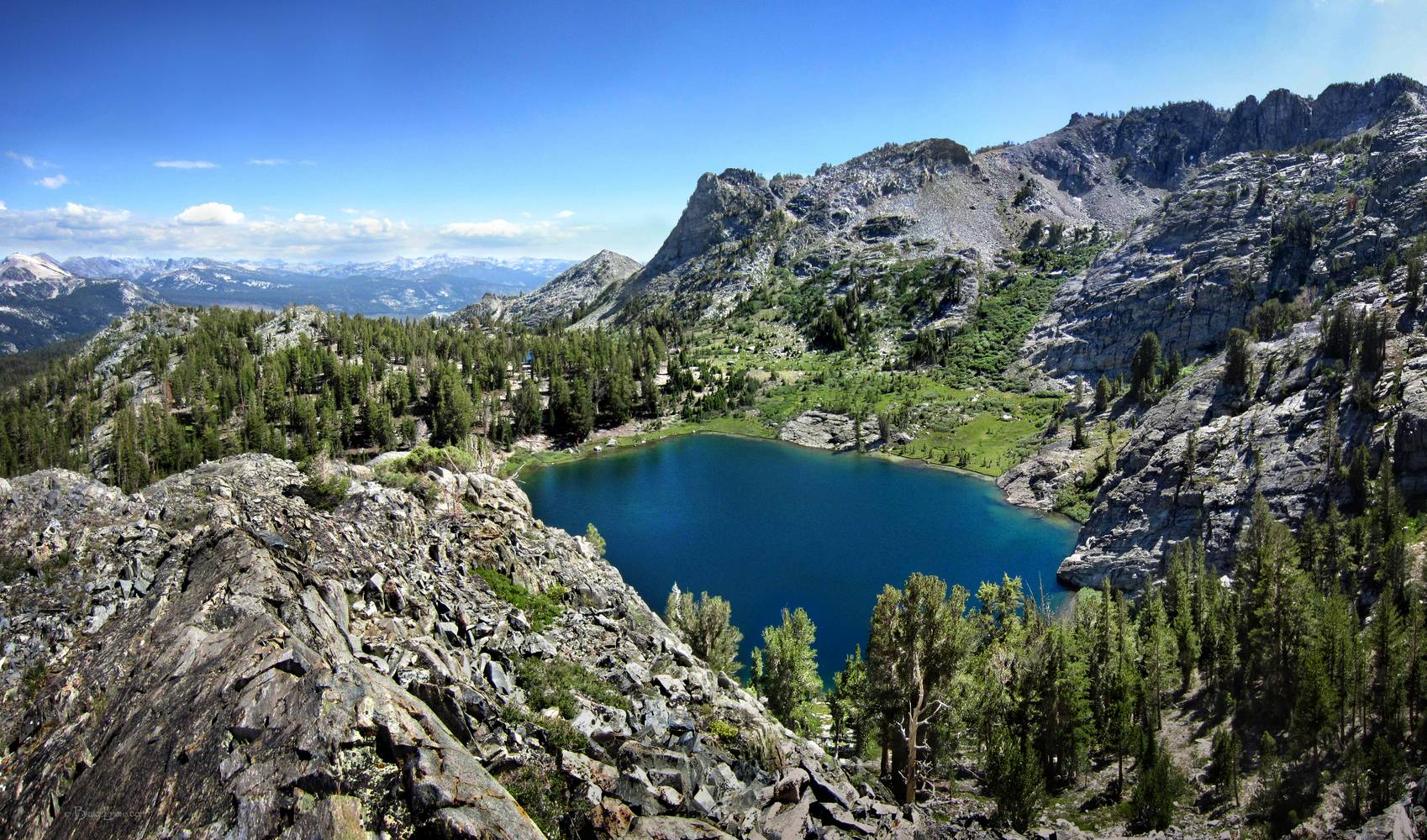 Emily Lake - Sierra Emily Lake with Castle Lake barely visible peeking through the trees behind, and Mammoth Mtn on the horizon at far left. California, Sierra Nevada mountains, Ansel Adams Wilderness. Off the John Muir Trail near Mile 052.