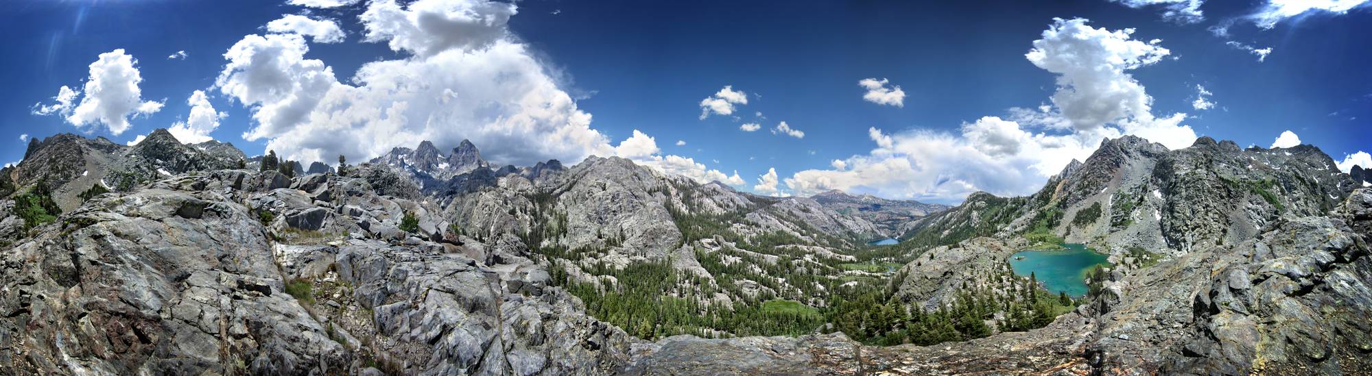 Looking ENE from just above Cabin Lake, overlooking the Shadow Creek drainage and Shadow Lake. To the left are the Minarets, then Mt Ritter and Banner Peak prominent at left center, then San Joaquin Mtn and the Two Teats at center on the far horizon behind Shadow Lake and Shadow Creek, with the Volcanic Ridge to the right above bright turquiose colored Cabin near camera. Lake California, Sierra Nevada Mountains,Ansel Adams Wilderness, Cabin Lake. Off the John Muir Trail near Mile 049.