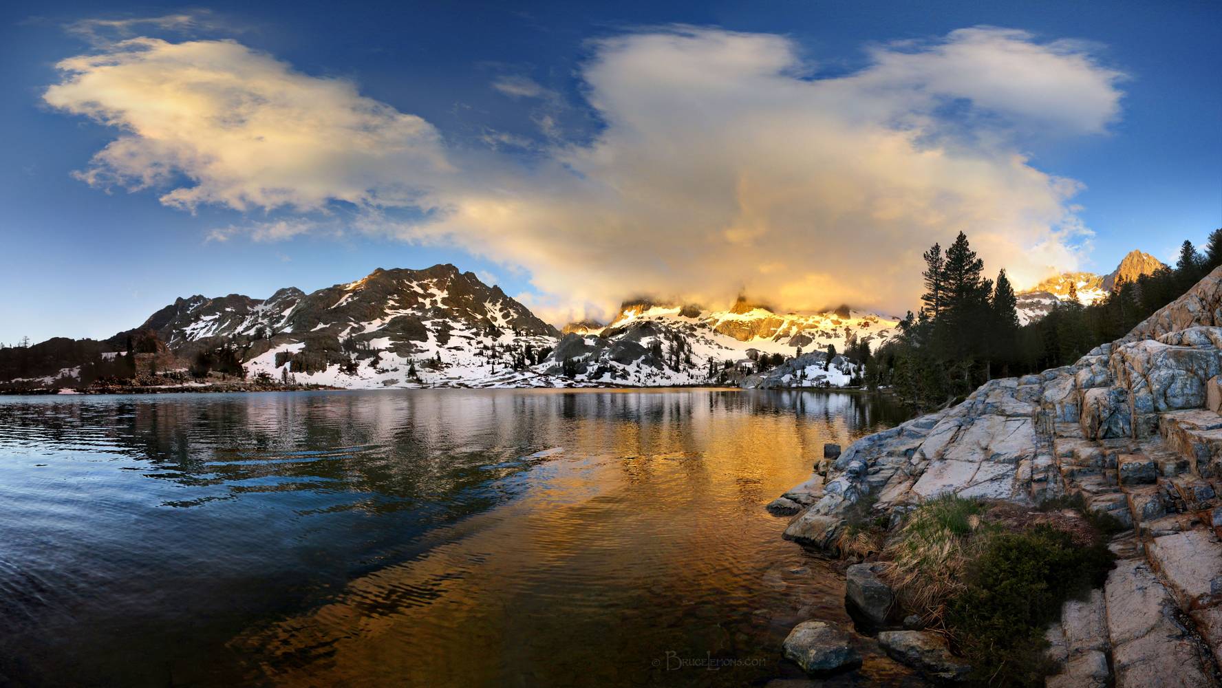 Ediza Lake Sunset - Sierra Nevada Mountains Cloud shrouded Minarets glowing orange in the rising sun glow above Ediza Lake. California, Sierra Nevada Mountains, Ansel Adams Wilderness, Minarets. Off the John Muir Trail near Mile 049.