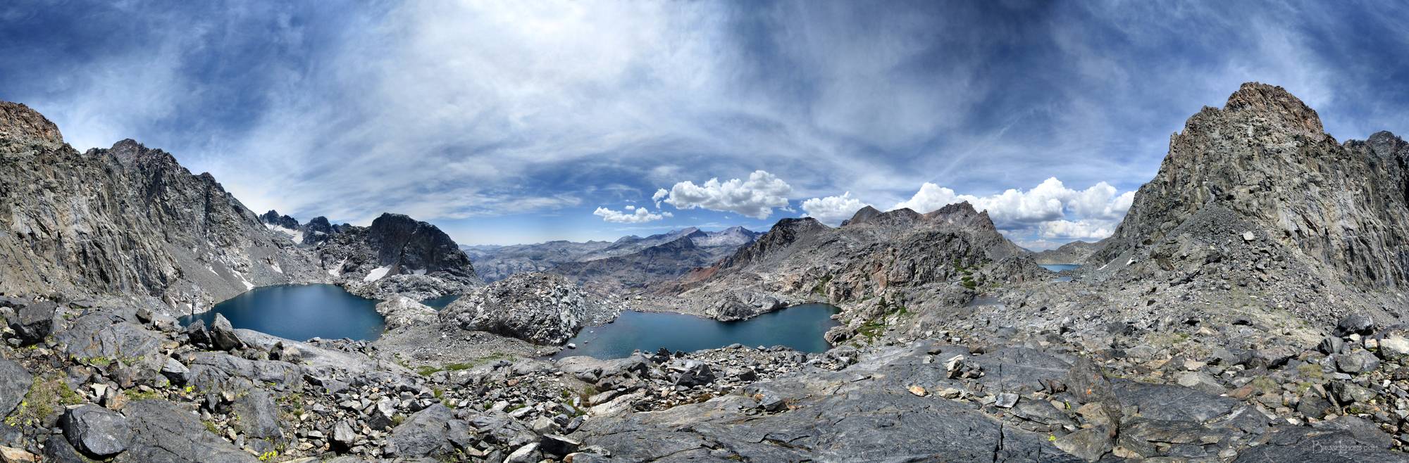 Looking SW over the Lower Ritter Lakes across the upper north Fork of the San Joaquin River Canyon, Bench Canyon, and just a tiny sliverof the Twin Island Lakes at center left, with Lake Catherine peeking out in the background at right below the shoulder of Mt Ritter barely in frame far right. California, Sierra Nevada Mountains, Ansel Adams Wilderness, Ritter Lakes. Off the John Muir Trail near Mile 044.