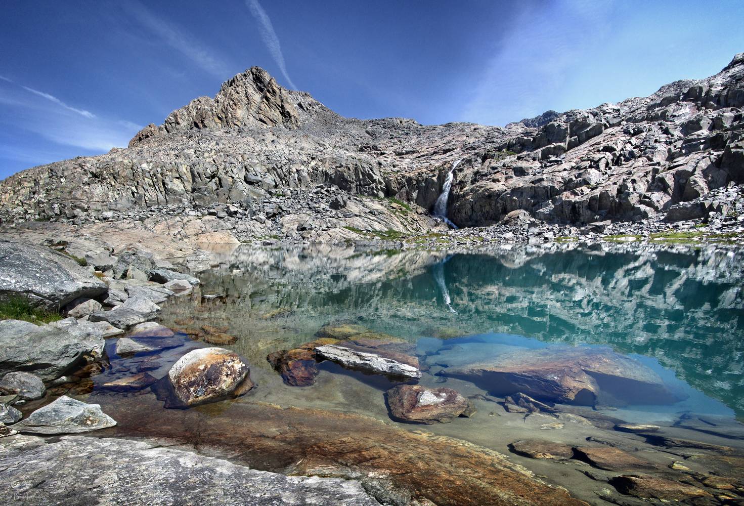 Waterfall and lake below Lake Catherine at the headwaters of the North Fork of the San Joquin River. California, Sierra Nevada Mountains, Ansel Adams Wilderness, Lake Catherine. Off the John Muir Trail near Mile 044.