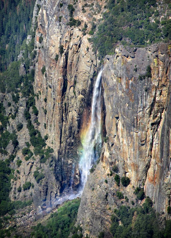 Bridalveil Falls and it's rainbow viewed fom Stanford Point high above on the South rim's Pohono Trail. California, Sierra Nevada mountains, Yosemite National Park, Yosemite Valley. Off the John Muir Trail near Mile 000.