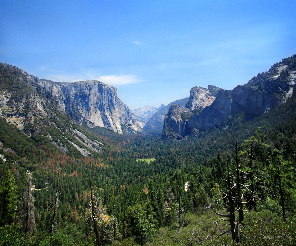 Yosemite Valley from Artists Point. Left to right is El Capitan, Half Dome peeking out in the far distance, Cathedral Rocks, and Bridalveil Fall. California, Sierra Nevada Mountains, Yosemite, Yosemite Valley, Artists Point. Off the John Muir Trail near Mile 000.