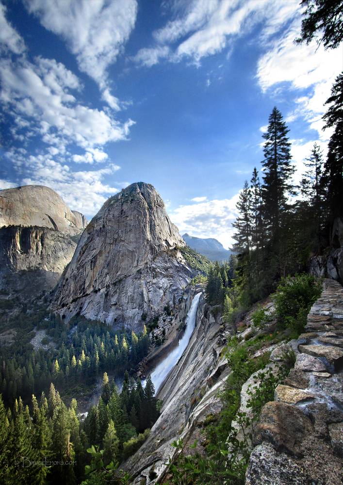 Liberty Cap and Nevada Fall from the John Muir Trail - Yosemite Liberty Cap and Nevada Fall from the John Muir Trail approaching nevada Fall. California, Sierra Nevada mountains, Yosemite National Park, Yosemite Valley. John Muir Trail Mile 003.