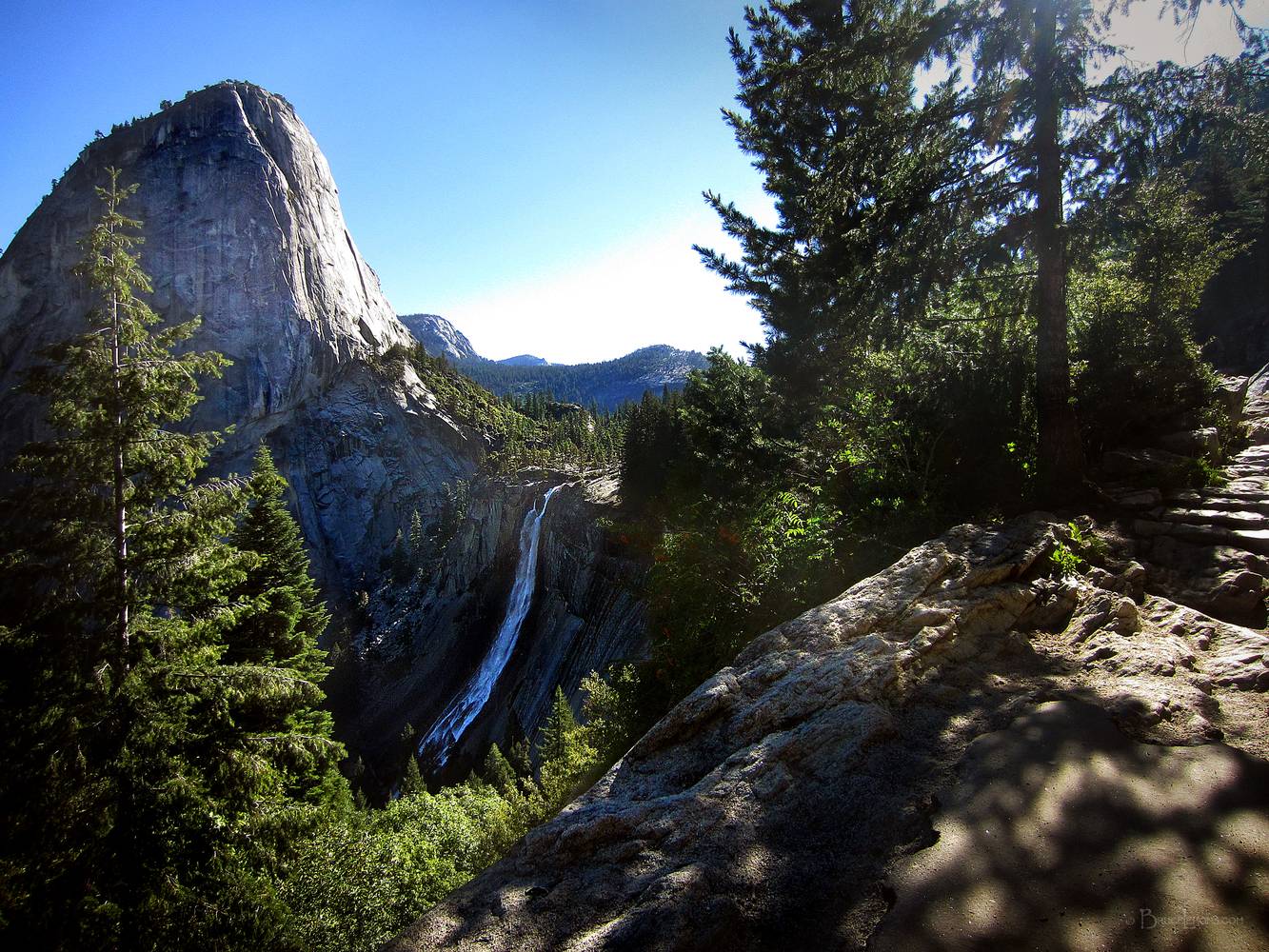 Nevada Fall and Liberty Cap - John Muir Trail Nevada Fall and Liberty Cap. California, Sierra Nevada Mountains, Yosemite, Yosemite Valley, Nevada Fall. John Muir Trail Mile 003.