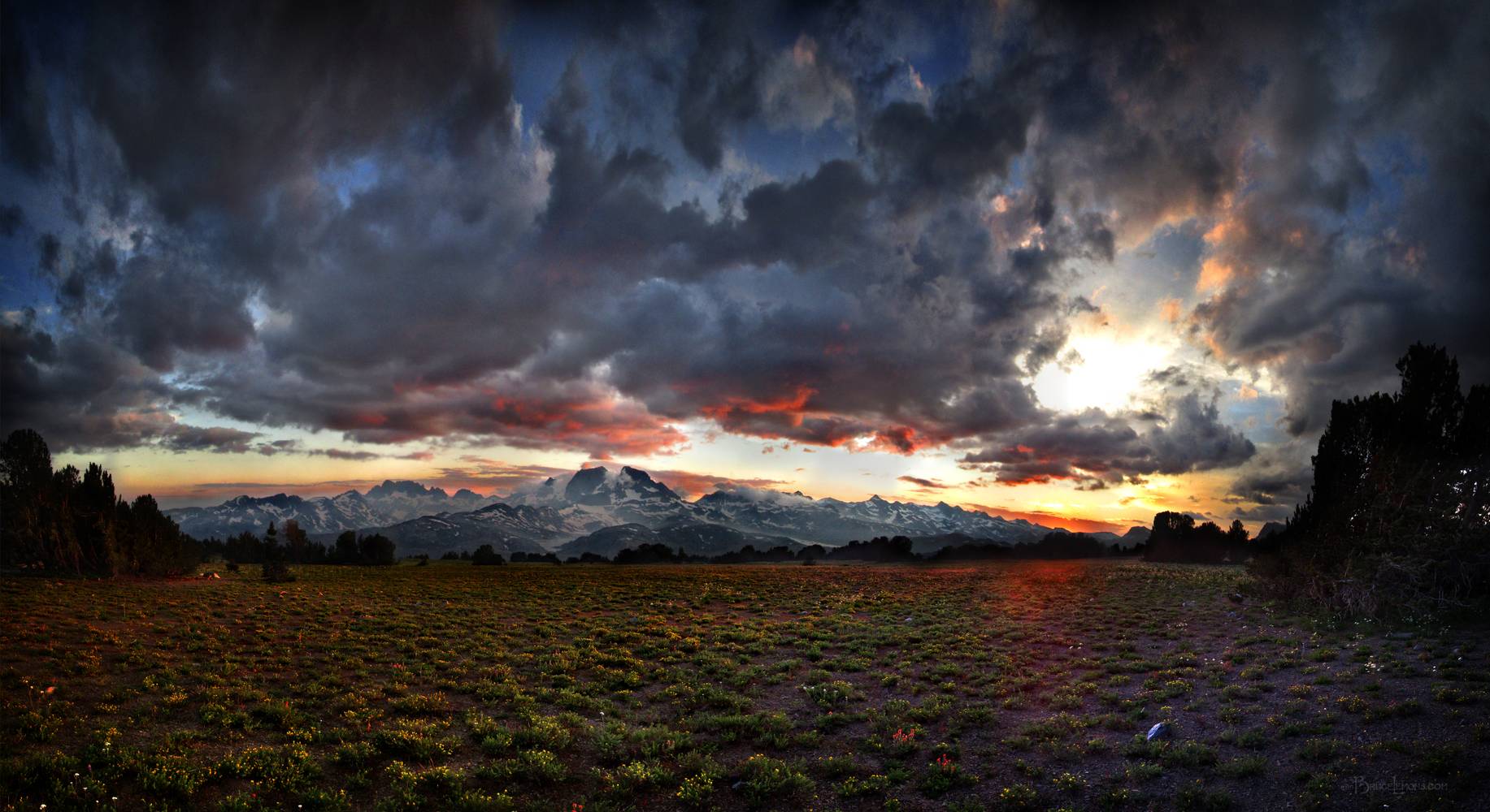 Sunset panorama from the plateau NW of San Joaquin mountain, with the Minarets, Mt Ritter, Banner Peak, Garnet Lake, and Thousand Island Lake at center. California, Sierra Nevada Mountains,Ansel Adams Wilderness, San Joaquin Mtn. Off the John Muir Trail near Mile 044.