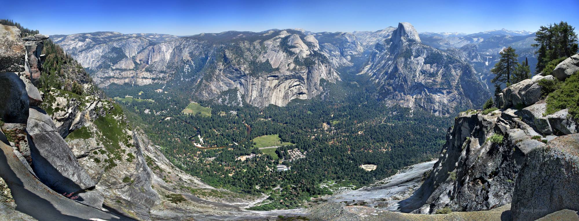 Glacier point panorama of Yosemite Valley, with Yosemite Falls at left, North Dome at center, Half Dome at center right, and the Mist Trail's Nevada and Vernal Falls to the right. California, Sierra Nevada mountains, Yosemite National Park, Yosemite Valley. Off the John Muir Trail near Mile 000.