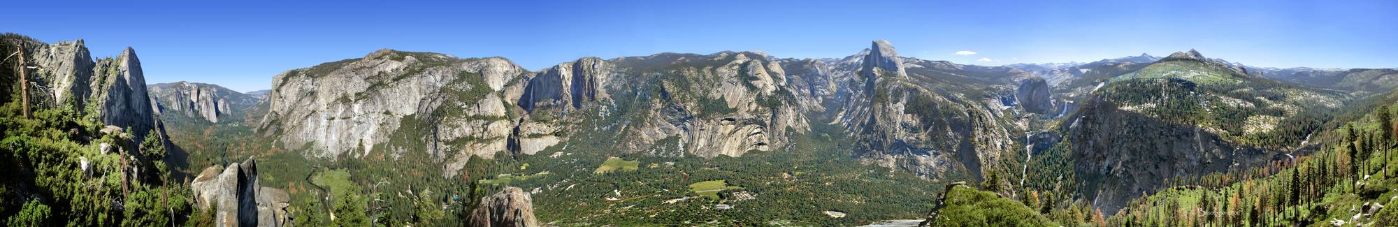 The entire length of Yosemite Valley viewed from the South Rim's Union and Glacier Points, with Sentinel Rock, Cathedral Rocks, El Capitan, Yosemite Fall, North Dome, Half Dome, Vernal Fall, Nevada Falls, and just a sliver of Illilouette Fall from left to right. California, Sierra Nevada mountains, Yosemite National Park, Yosemite Valley. Off the John Muir Trail near Mile 000.