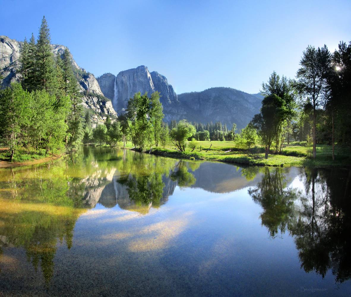 Yosemite Falls from Merced River - Yosemite Valley Upper Yosemite Fall reflected in the Merced River. California, Sierra Nevada mountains, Yosemite National Park, Yosemite Valley. Off the John Muir Trail near Mile 000.