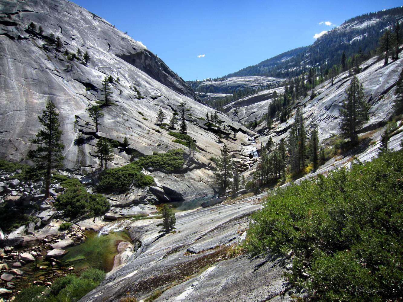 Merced River Valley Below Merced Lake - Yosemite Merced River between Merced Lake and Little Yosemite Valley. California, Sierra Nevada Mountains, Yosemite, Little Yosemite Valley. Off the John Muir Trail near Mile 005.